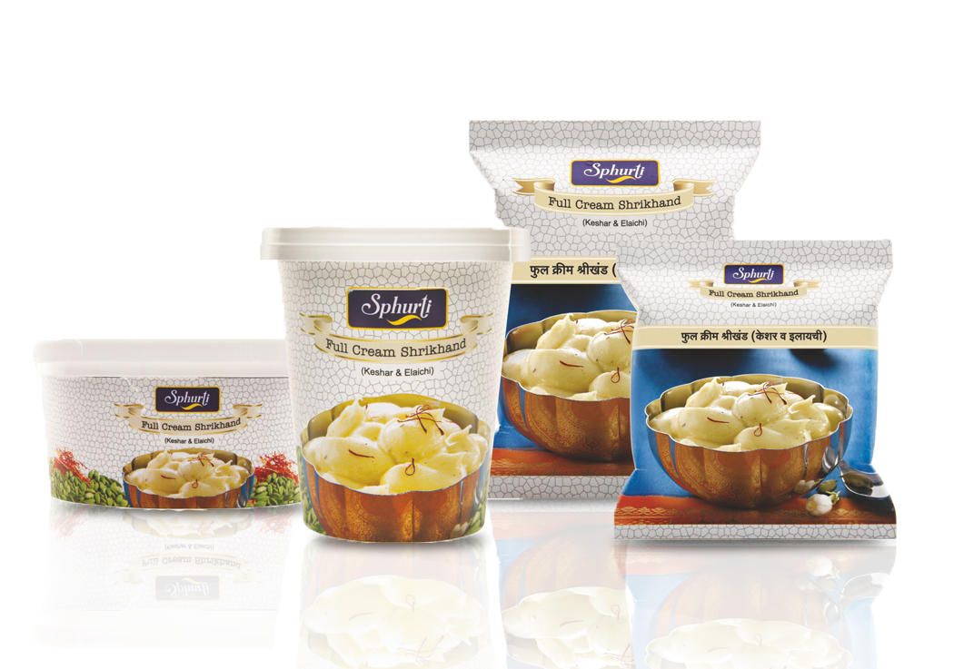 Sphurti Shrikhand is an Indian sweet dish made of strained yogurt. It is one of the main desserts in Gujarati cuisine and Maharashtrian cuisine.The yogurt is tied and hung until all the water has drained off, the result being a thick and creamy yogurt. The main ingredients are sugar, cardamom powder, and saffron. Shrikhand is mainly popular in western India.